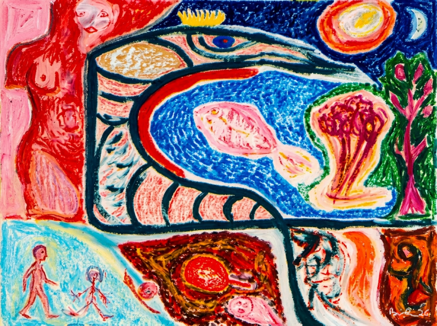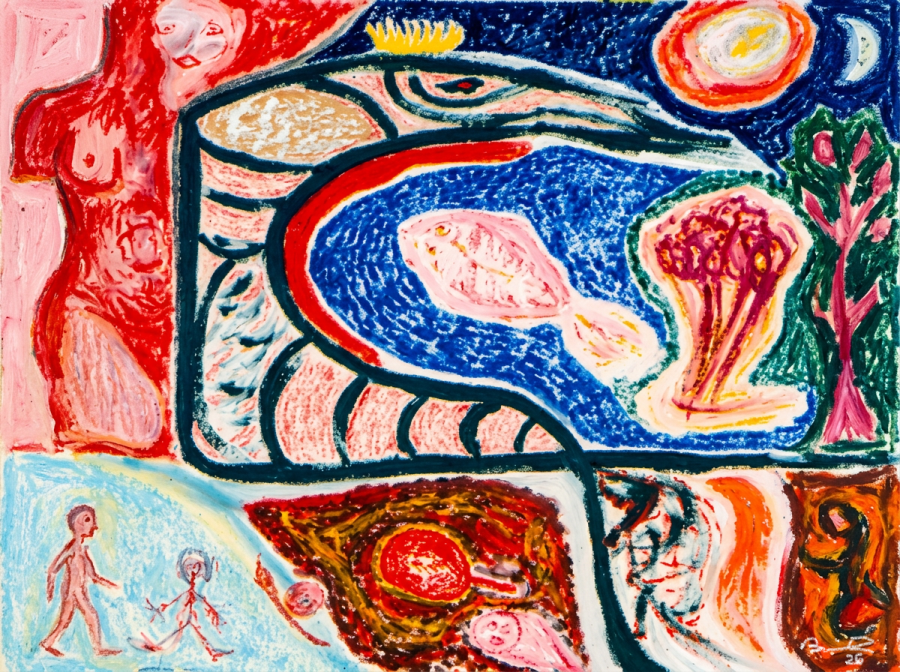 "Der Froschkönig und sein Reich" 1992. Acryl und Ölpastell auf Pappe. 80x75 cm